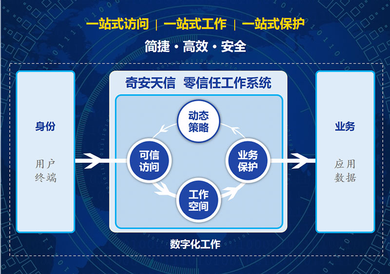 张泽洲表示,和过去关注网络和边界的安全产品不同,奇安天信以身份为基石、以数据为中心,通过“可信访问、工作空间、业务保护、动态策略”四大核心能力,打造基于零信任的“一站式”安全工作入口,实现“身份化可信访问、工作开展不受限”,“场景化工作空间、工作效率不打折”,“体系化业务保护、工作数据不泄露”,“一体化动态策略、工作风险不延误”等数字化目标。