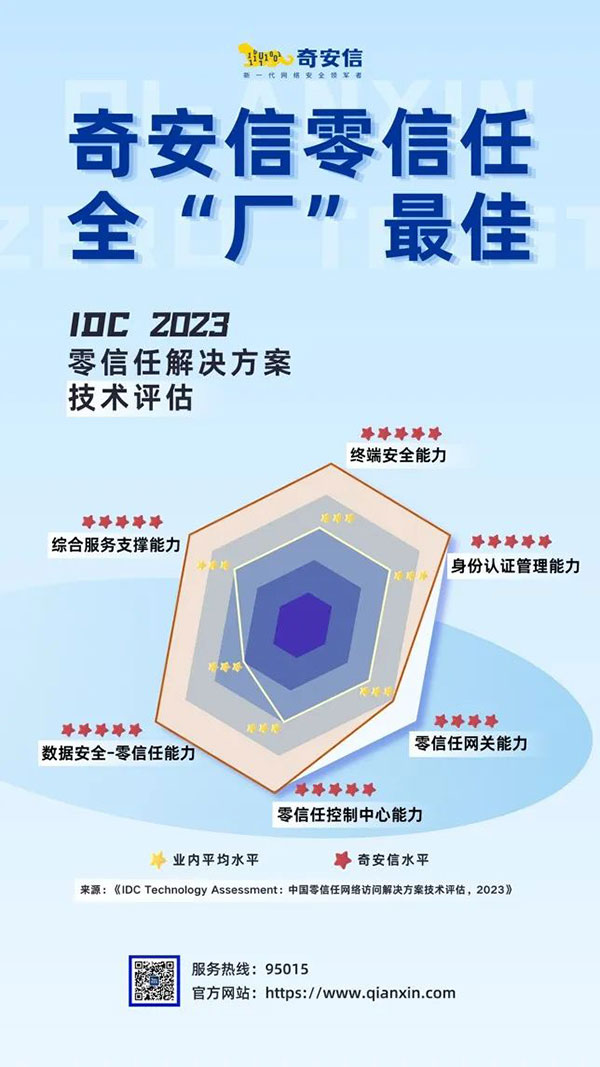 作为国内零信任安全的首倡者,奇安信于2018年率先将零信任安全理念及技术系统介绍到国内。目前,奇安信在零信任领域成果丰硕,广受业内认可,相关产品曾获得第十届吴文俊人工智能科技进步奖(企业技术创新工程项目),也是国内首个零信任国家标准《信息安全技术零信任参考体系架构》的牵头单位。而IDC最新报告也显示,奇安信零信任网络访问解决方案在所有六项关键技术能力评估中均取得最优成绩,成为所有入围企业中,唯一获得五个五星、技术评估雷达图最接近正六边形的企业。