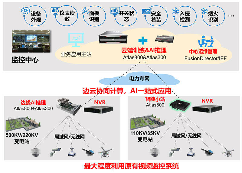 在边缘侧,按需部署AI推理计算设备,按变电站场景需求个性化部署算法模型,对接入多种视频图像数据进行实时分析,监视变电站内设备状态、人员作业、生产安全等情况,及时发现异常情况进行风险预警,实现24小时实时智能视觉主动监控。