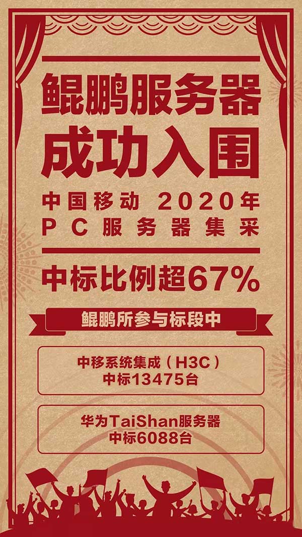 在入围的鲲鹏服务器总量中,华为TaiShan中标数量为6088台,新华三UniServer R4960 G3中标数量达到13475台,两者合计占到此次中国移动服务器集采数量的14%,可谓意义重大,代表着鲲鹏计算面向市场的一大突破。